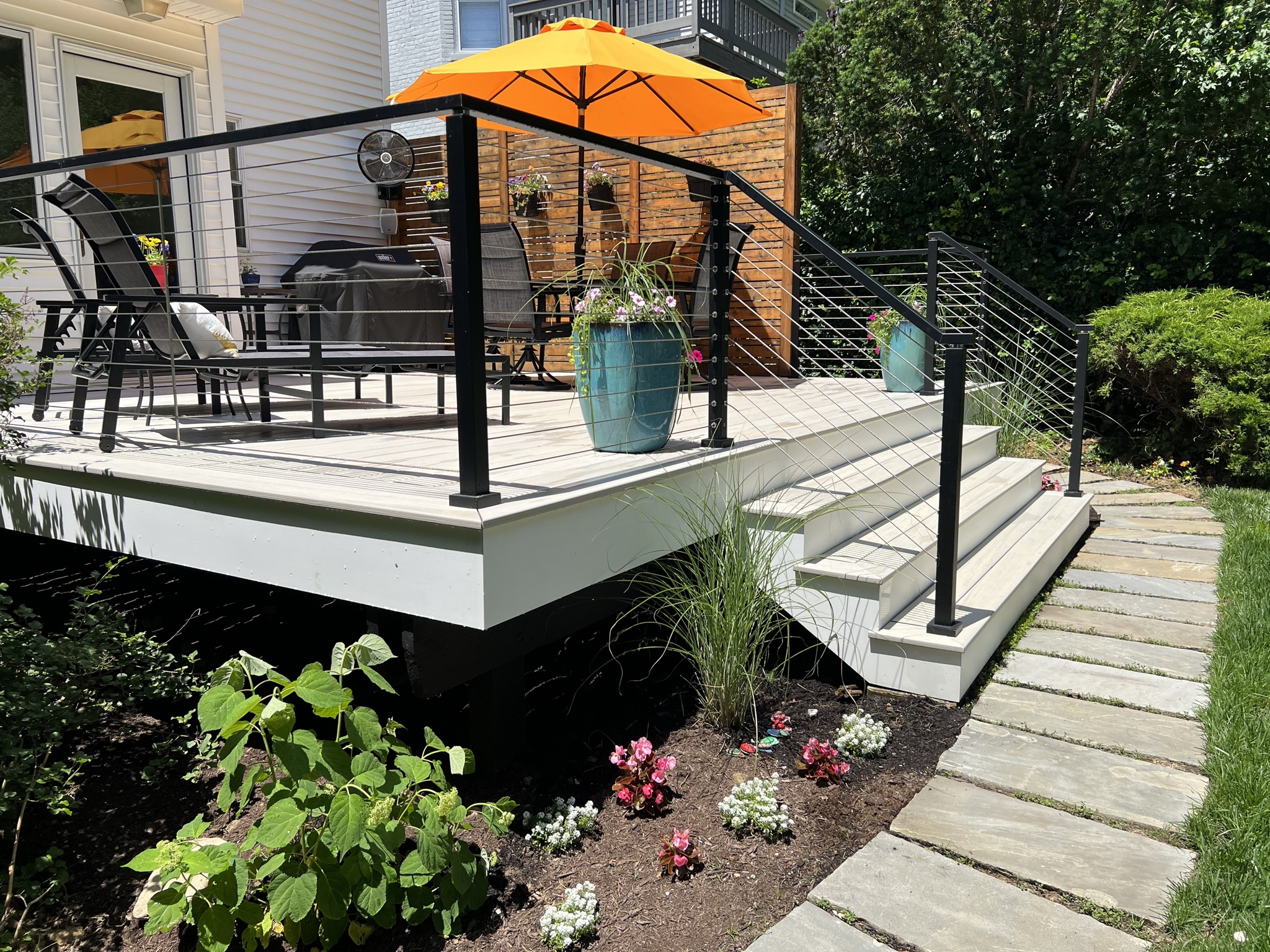 I designed a picture frame on the corners to prevent having ugly exposed ends. Also designed white fascia boards using 1" AZEK PVC Trim Board to completely cover the exposed pressure treated stringers. These details are not typically done by deck builders. Probably because they take a lot of extra time, but the end result is super clean.
