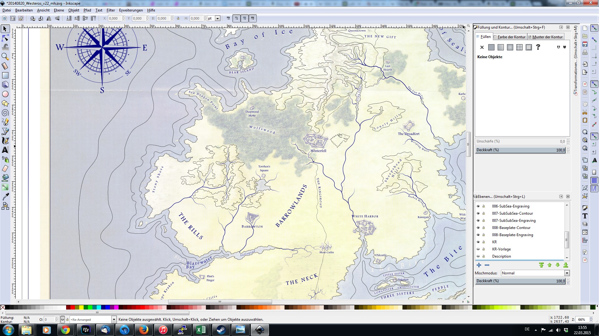 I bought a set of large-format maps of Westeros (http://amzn.to/1OlX9L0) and had them scanned at a local shop. Then I used Inkscape and a graphics tablet to trace around all the edges, mountains, depths etc as well as place names, rivers, forests, ...