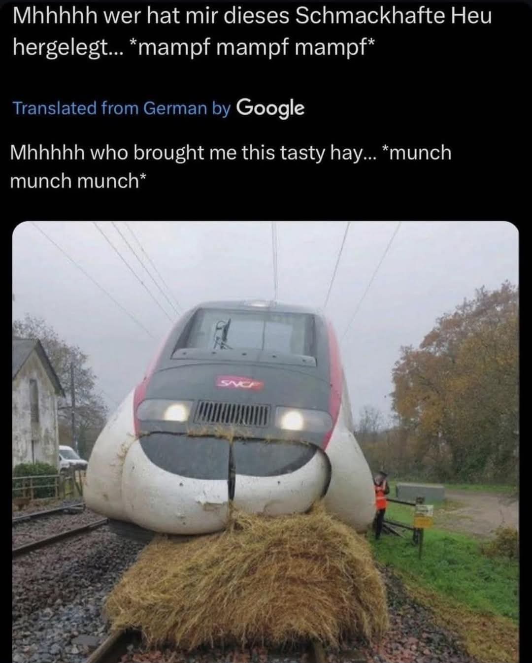 Not hay but I was on a TGV once that abruptly stopped just outside Aix-en-Provence. Conducteur explains why we've stopped, I'm translating for my wife and some other English speakers around us. We had hit a sheep, or rather, going ~185mph, we had vaporised a sheep on the line but had stopped to assess the damage (to the train)