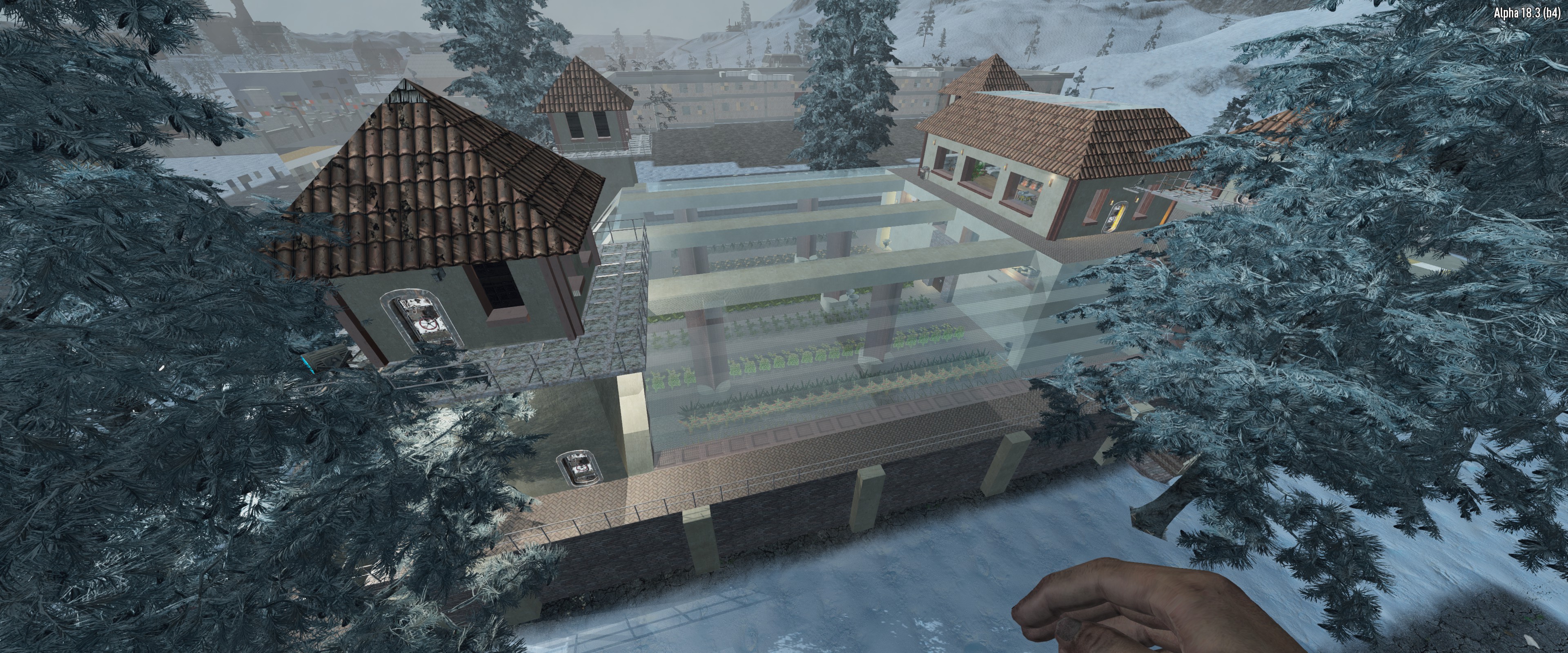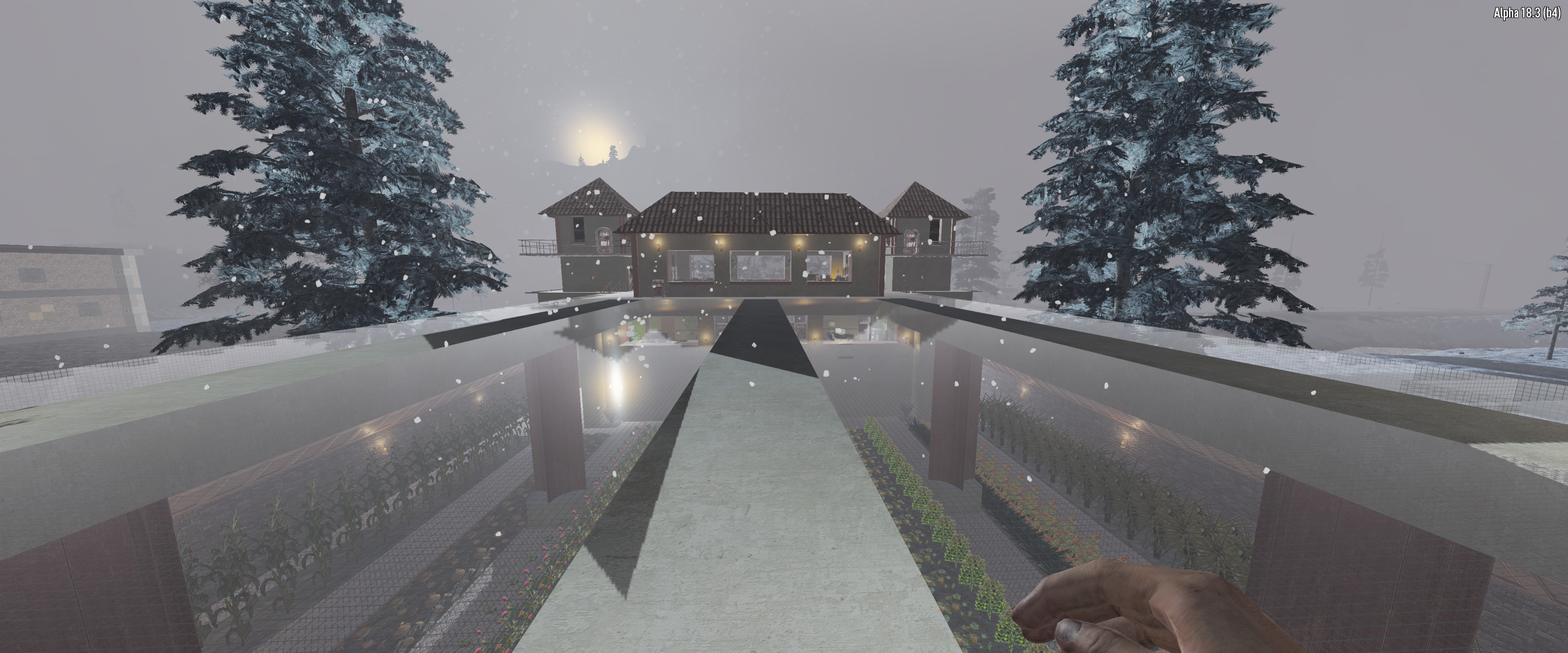 After - I used the nitrogen mod to make the entire map a snow biome. Even though food will still grow, I had a personal requirement to require crops to be grown in a greenhouse and to renovate the POI into something my family could live in. I used several mods, but mostly a vanilla experience. HN and Guppy decor mods were used heavily here.