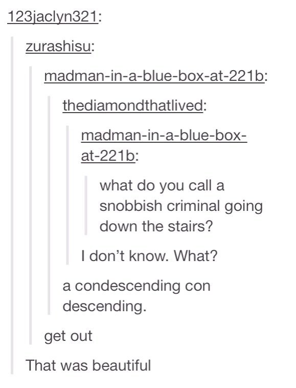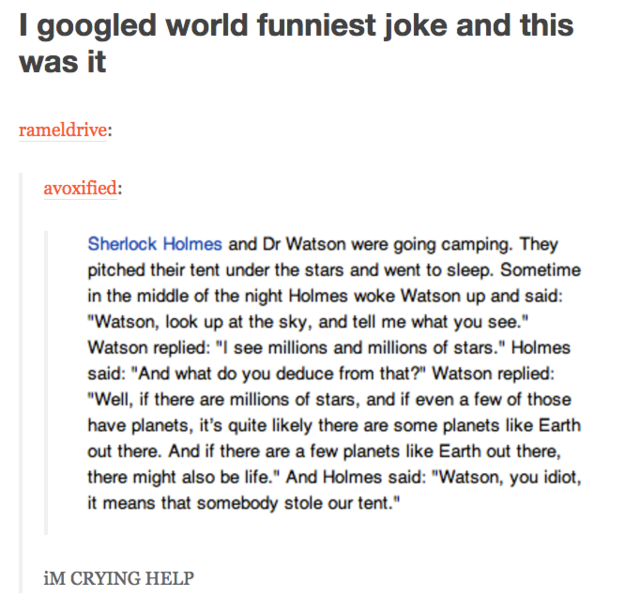 Ah, Tumblr. Where the joke doesn't end with the punch line, it ends with "get out" or "I can't even" or "did you just".