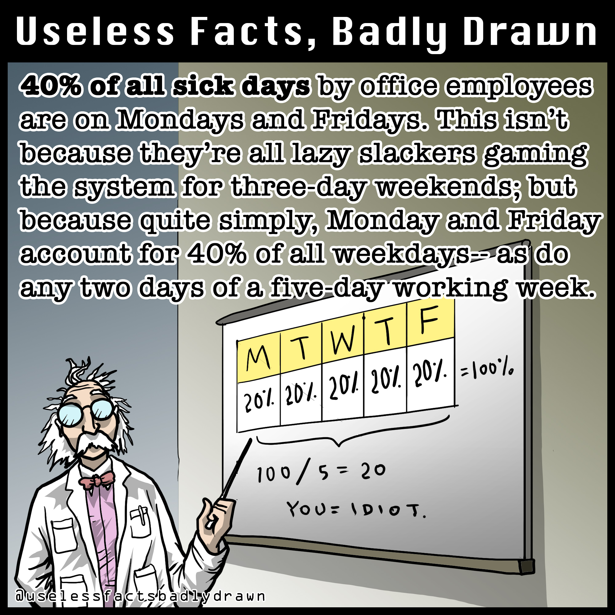 I especially hate this statistic, coz you know the person that came up with it had to know enough about maths and statistics to know that it's bullshit. Also, why do people feel the need to explain to their bosses why they need a day off? You're entitled to it, just like you're entitled to your weekend. No need to give a long sob story about why you can't come in to work (unless it's really last-minute, which is different).