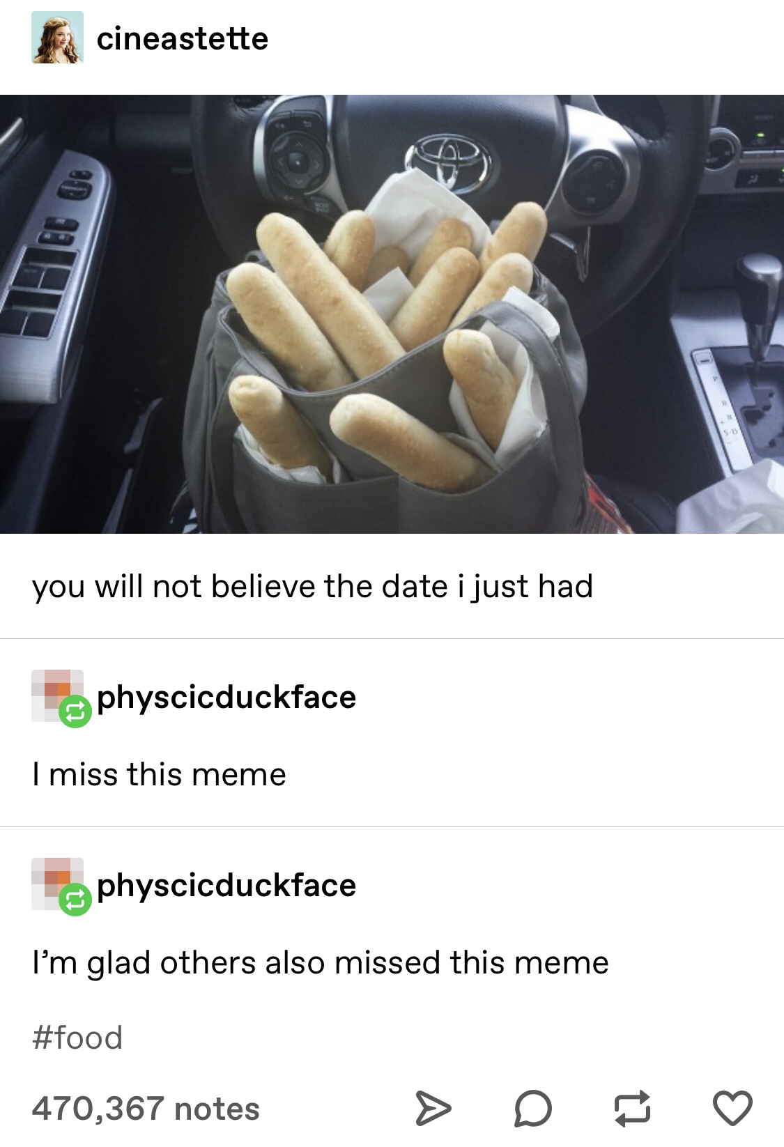 There was this whole "oh no my date is crazy, grab all the breadsticks and run" meme a few years ago.