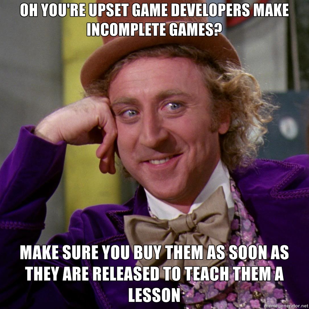 Doesn't bother me much either, I never buy a game as soon as it comes out anyway. Just tired of the righteous indignation that's prevalent.