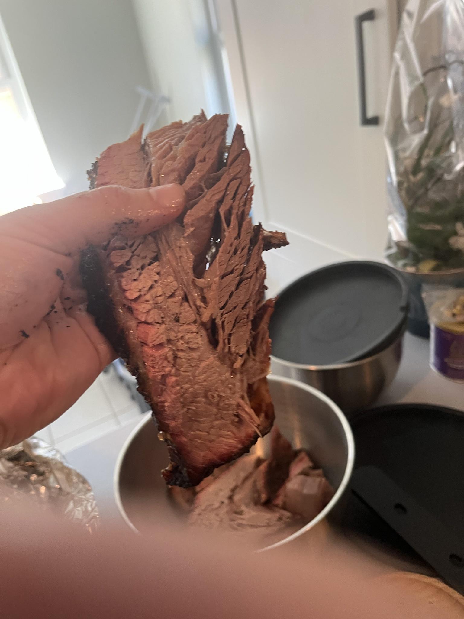 Here’s the point (fatty thick part). Same game plan. Once it hit 160f I did foil boat (about 1000) then left until it hit 200 at 400am. So a twelve hour cook time compared to again a usual 18 to 24 hours on an offset. Then it was wrapped in foil and put in the oven on warm.