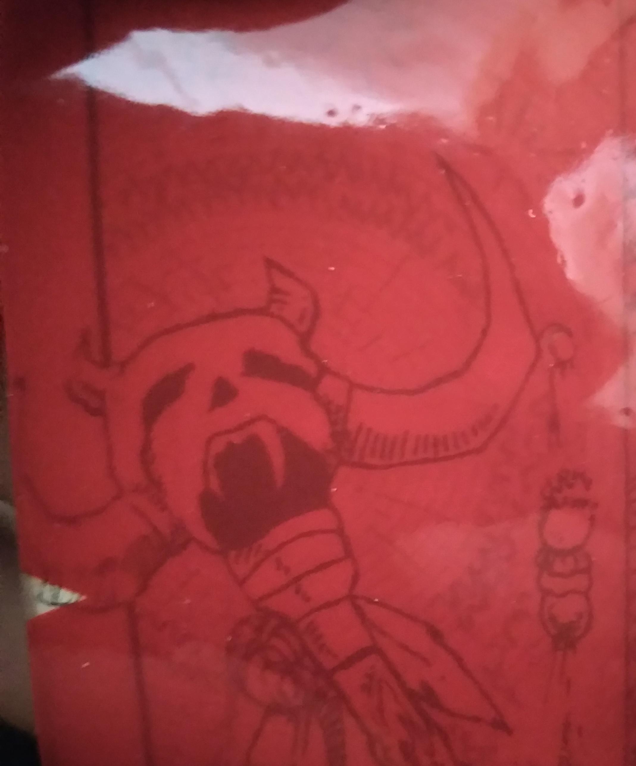 A sheet of transparent red tinted plastic. When held over certain pages, it blocks out the red ink patterns which obscure hidden details - and in the story is represented by a sort of Gem of true seeing your character owns, the Ruby of Seeing.