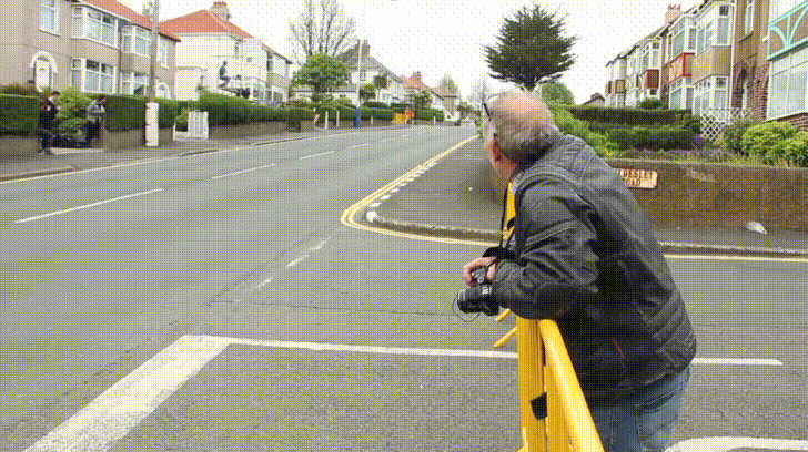 Yeah he's gonna get great pics of those bikes coming by at 200mph lol