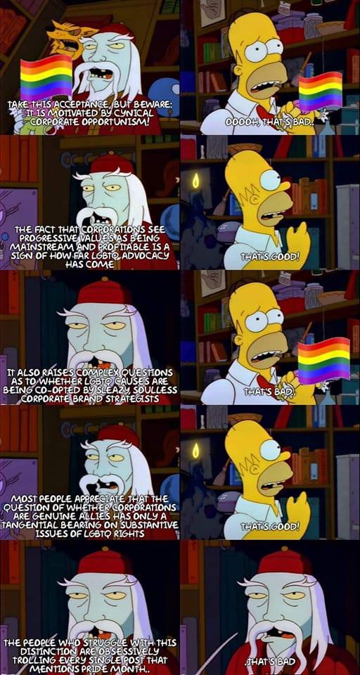 #31 the way I look at is this: fuck corporations, don't give them loyalty cause they don't have any for you, but if corporations boosting visibility of LGBTQIA+ wasn't a step in the process the fascists wouldn't be so upset by it.
