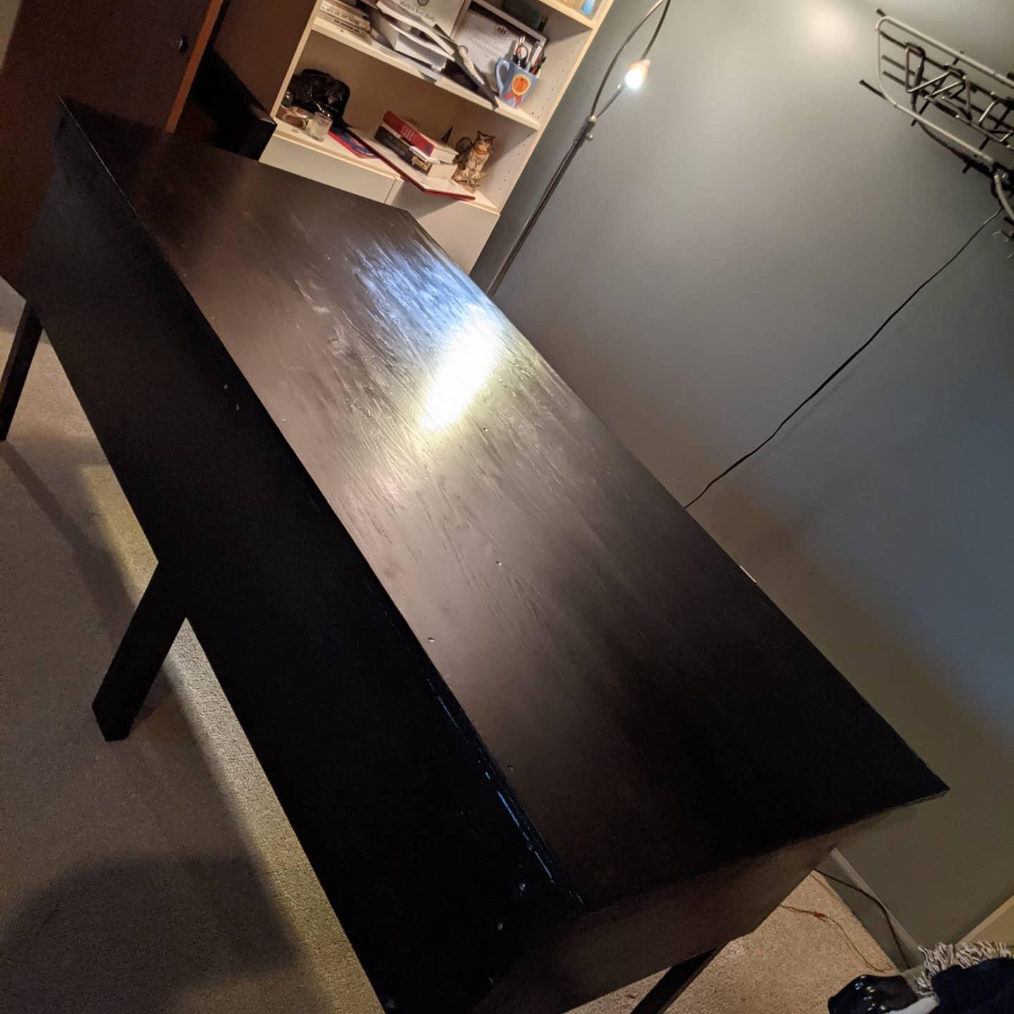 Sanded... 120, 220, 400 grit. 4 coats of minwax espresso stain. Took another 3 days just to do the staining. Didn't want to dry in the cold weather. The side skirts/legs are removable, because moving this chonky boy around would be a herculean feat otherwise.