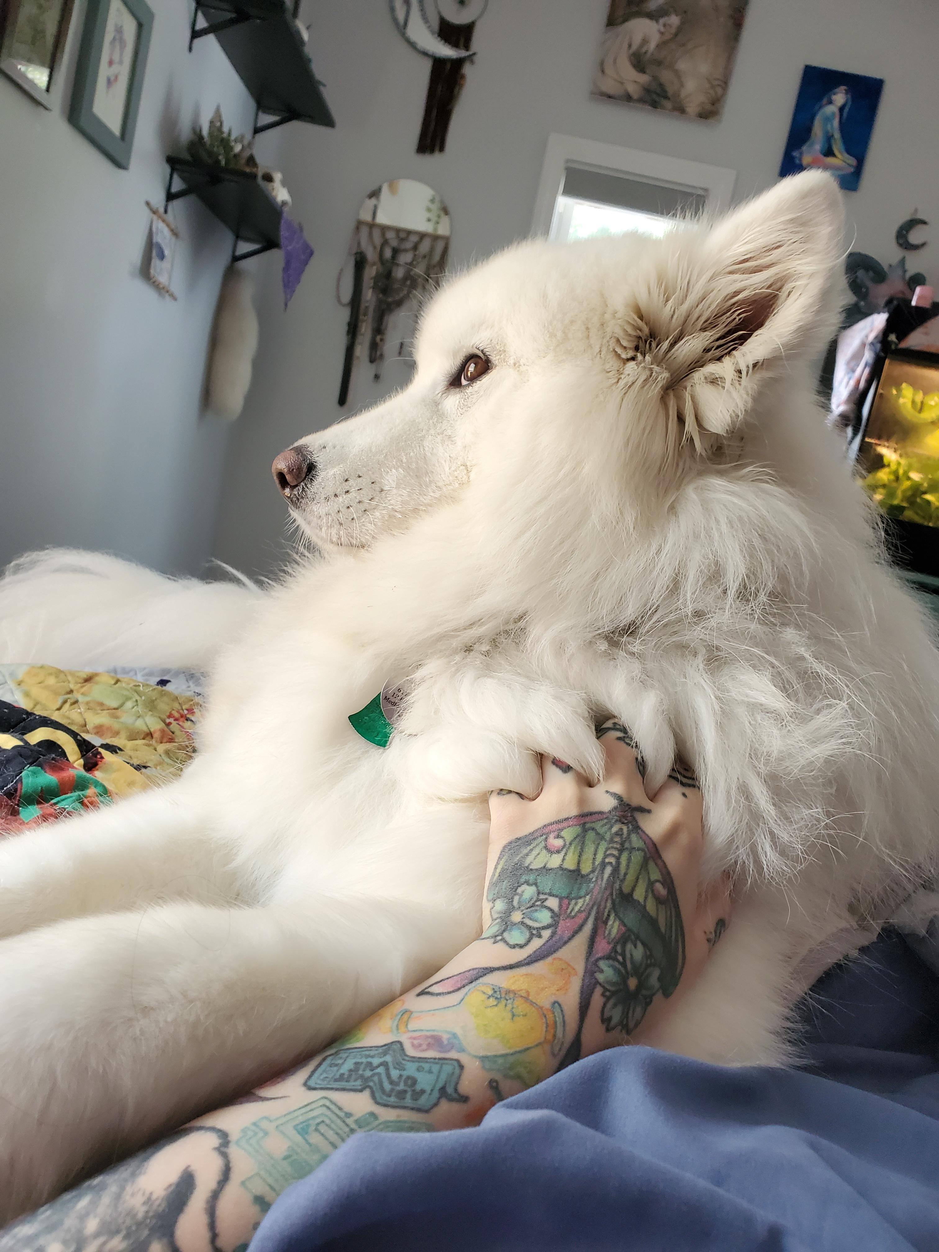 Dog tax: Amaterasu will give morning snugs if you offer her chest pets.