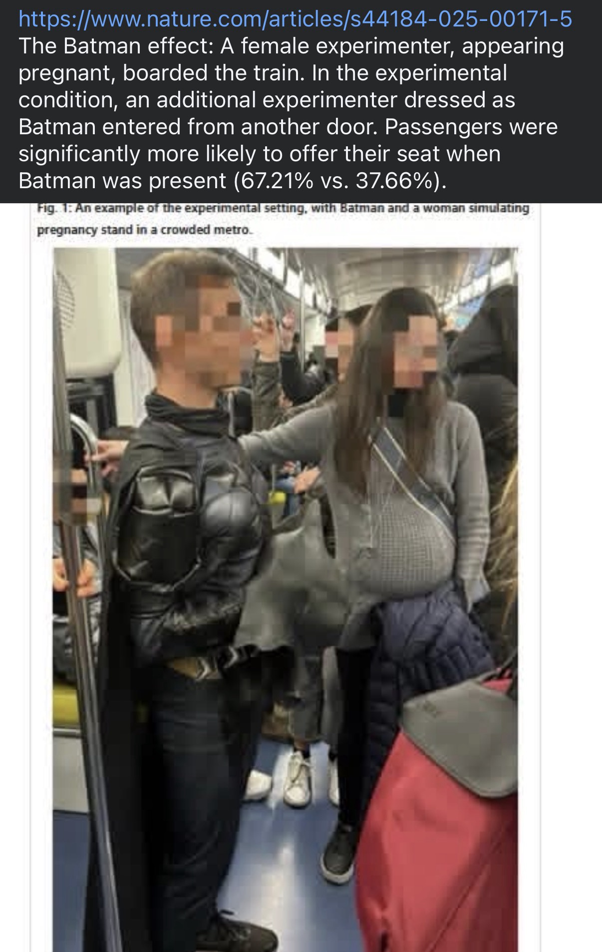 #2 I feel like this may be because more people stop to look at the man dressed as Batman and are therefore more likely to notice the pregnant woman, rather than because they want to “do good” around Batman. I wonder if him being dressed as a clown would have the same effect.