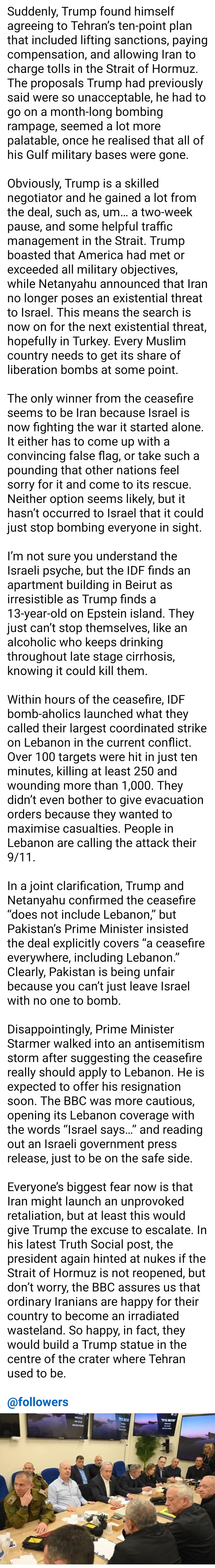 The only thing keeping Netanyahu's trial (and his eventual trip to jail) from proceeding is his insistence that it cannot proceed while under a national security threat, i.e. Israel will continue to be at war with someone (Gaza, Iran, Lebanon, et. al.) for the foreseeable future.