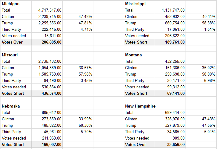 When we apply 68% against the 85 Electoral votes that were possible to switch to Clinton based solely on Third party candidates that gives us 58 votes, still short of the 71 needed minimum.