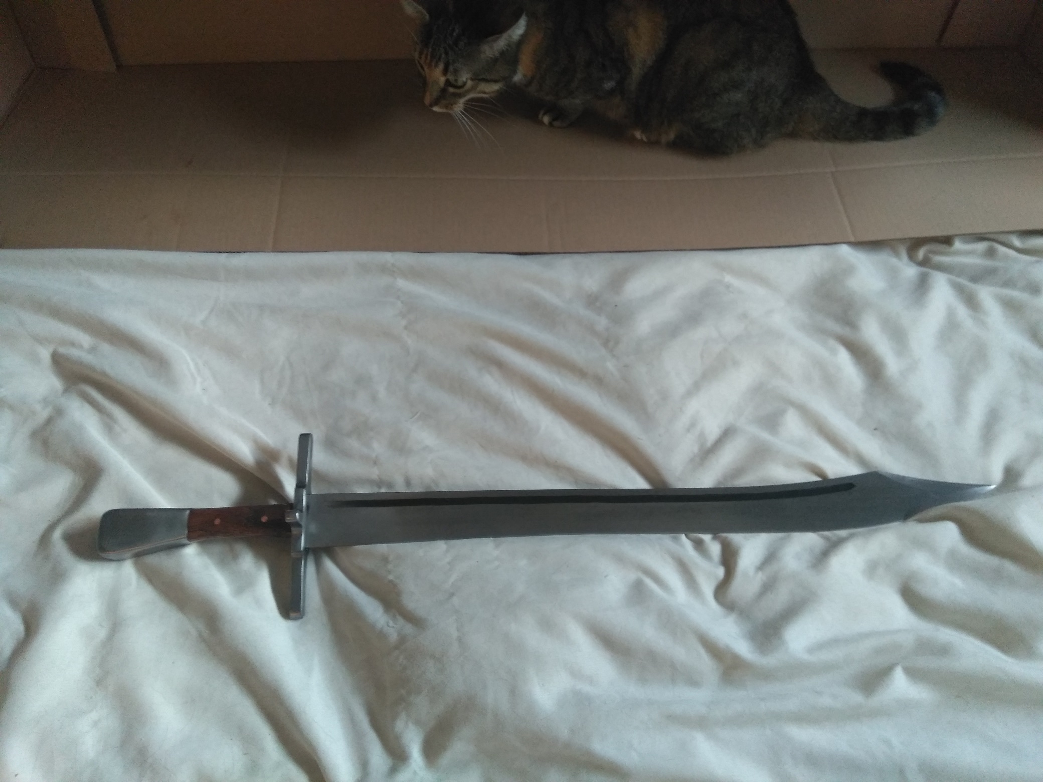 The messer is 27.7" long with a 22.4" blade. These were historically used by 'Landsknecht' mercenaries among others in the region that's now Germany.