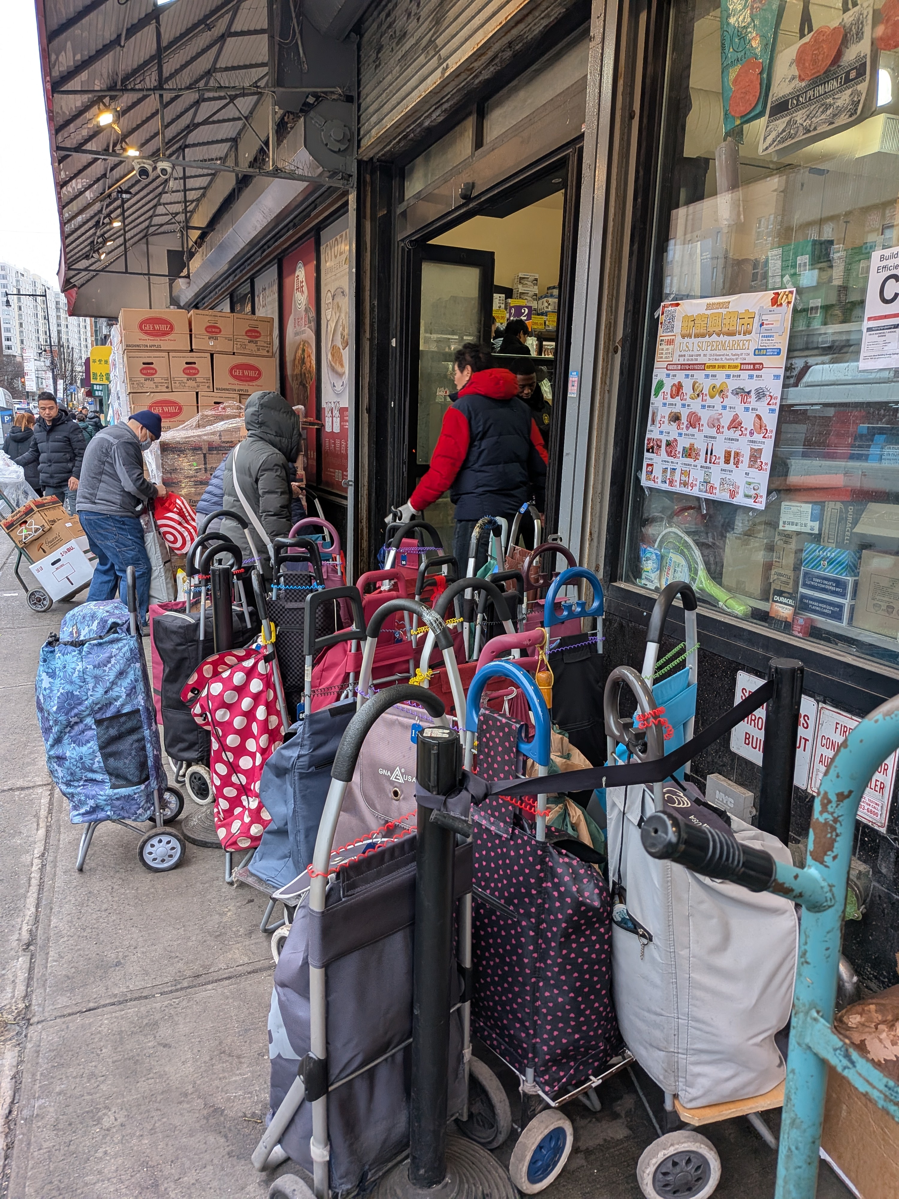 Flushing New York Chinatown cart parking since you don't have a car, you park your cart. They give you a number so you take your cart and not someone else's