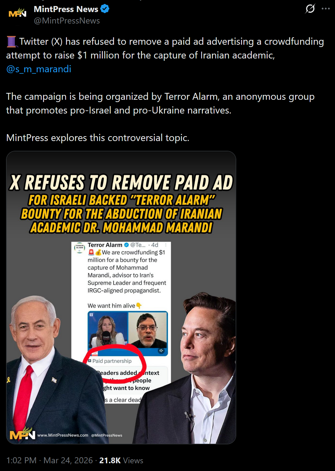 Elon Musk's Twitter/X promotes paid advertising for the abduction of professor Mohammad Marandi. And refuses to take it down.