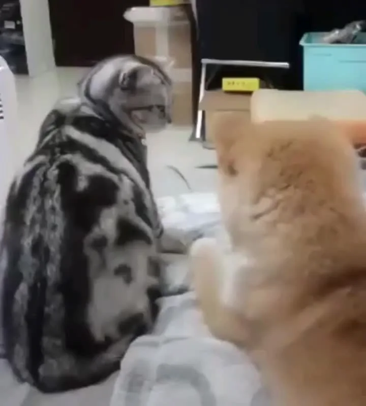 It's great how the Husky is trying to pet the cat like a human. Meanwhile, the cat is mentally preparing itself for a battle to the death.
