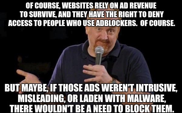 Yeah when a website denies me content due to Ad Block I usually just leave the website. I know I can find whatever it is elsewhere.