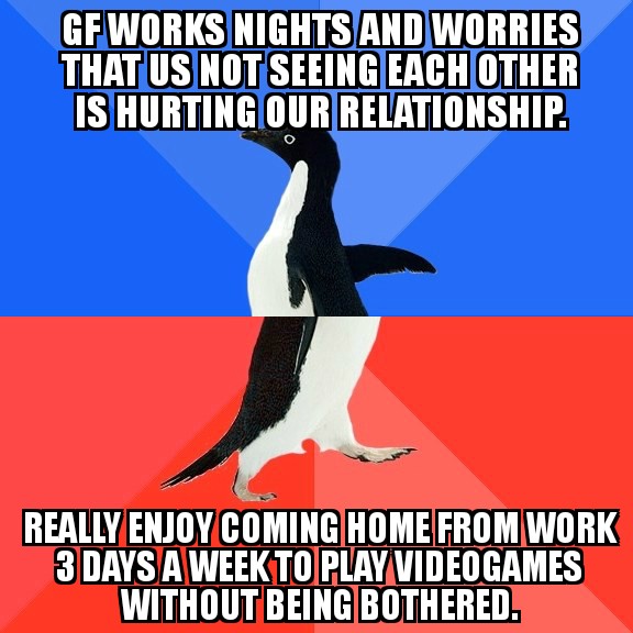 My SO and I sleep at her house wed/thurs and mine fri/sat/sun. She’s moving in next month and I think I’ll miss my 2 empty bed nights.